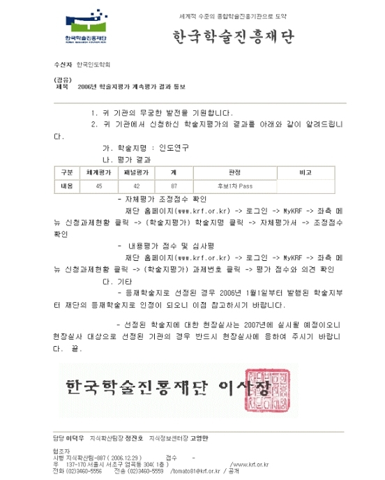 인도연구 학진 등재후보지 패스 (2006. 12. 31.)